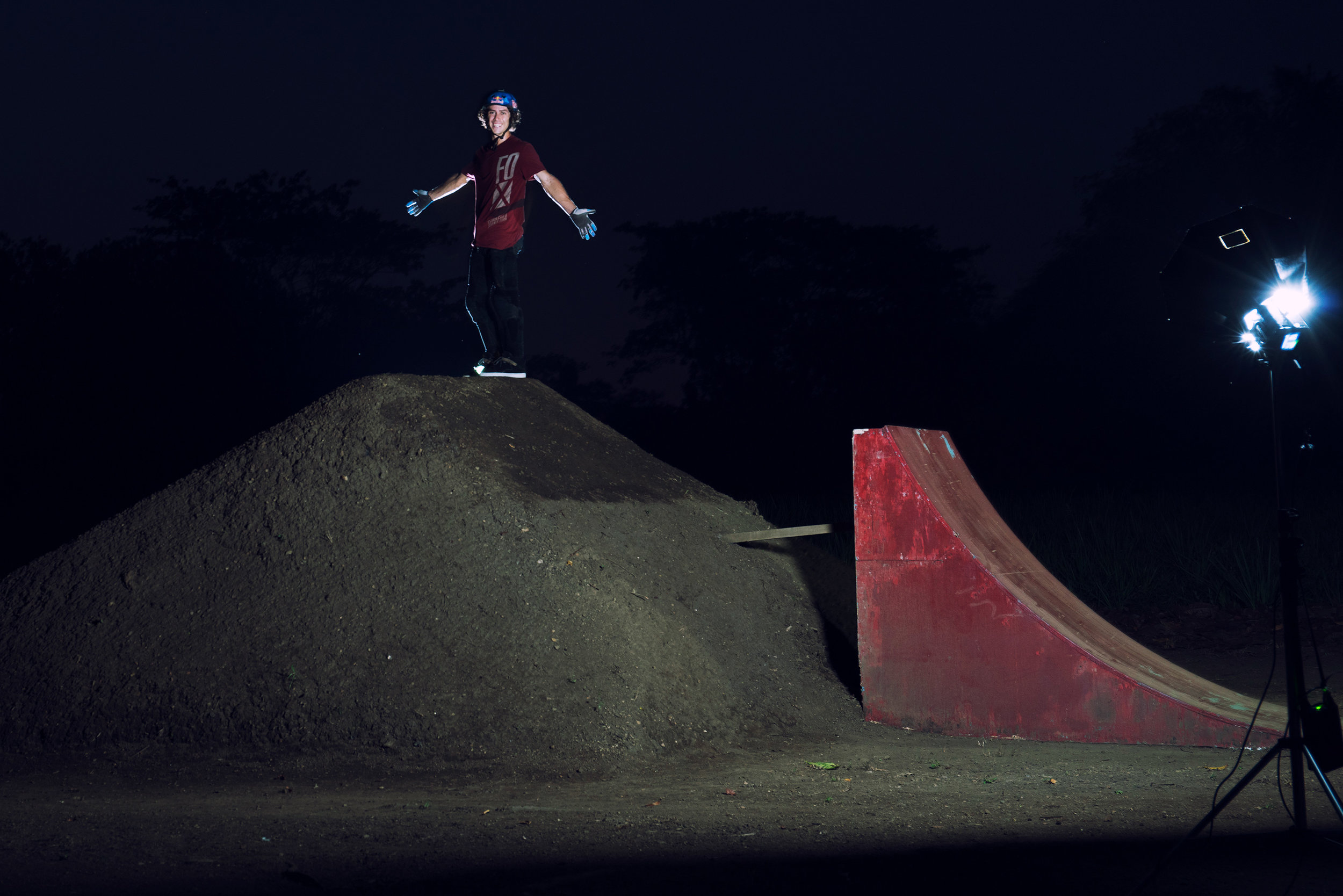 Y cuando hablo de precisión, hablo de Kenneth haciendo todo tipo de trucos super-radicales en casi completa oscuridad! ya que para poder lograr un fondo negro y ninguna forma que pueda generar distracción en el fondo de la foto, el atleta solamente contaba con la luz baja de su carro desde lo lejos apuntando a la base de la rampa de despegue, y una escasa luz de celular que iluminaba el aterrizaje…